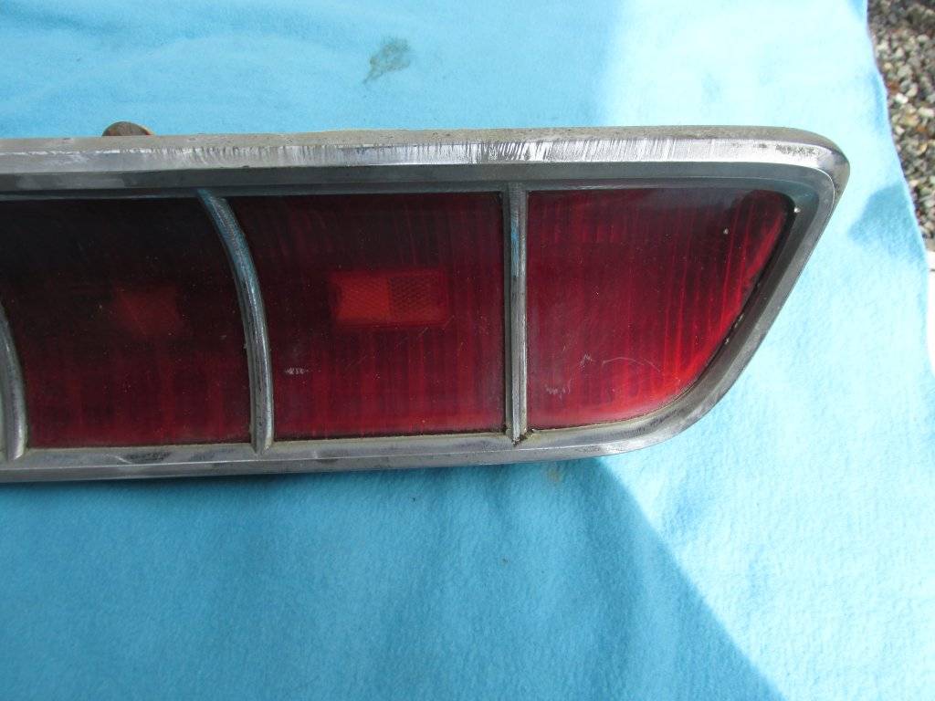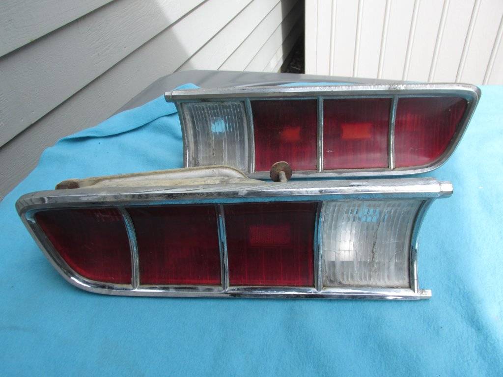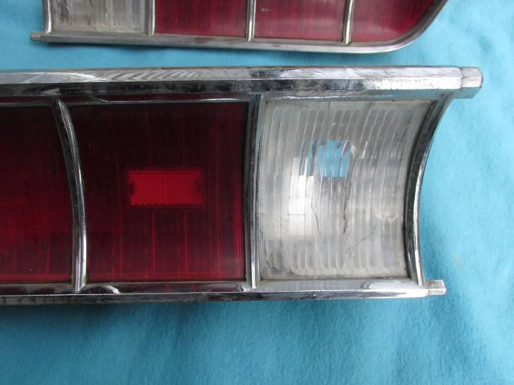 For Sale - Pair of used tail lights for 1965 Chrysler. Both used condition. The red lenses look good, and the clear back up lenses have some visual cracking but it doesn't look like they are structural cracks. The chrome bezels are not cracked or broken, but they have some aging and discoloration on the chrome. The left bezel is the better one. The right bezel has pitting and the chrome is thinning and discoloring mainly along the top edge and on the vertical strips.
