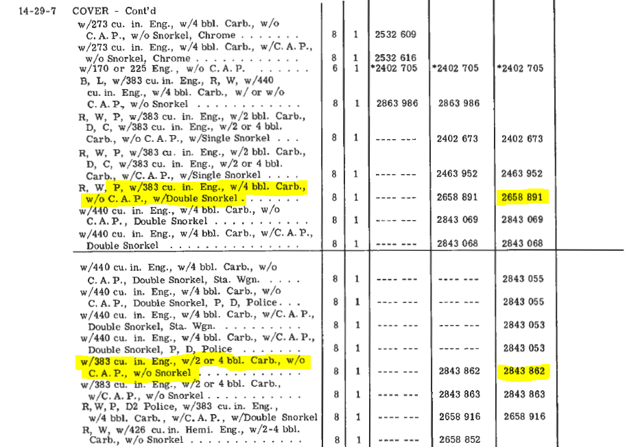From looking through the parts books it looks like the '67 383 4bbl., for Plymouth, uses the dual snorkel air cleaner with the round snorkels(the same part number as a '66 383 4bbl., and I think they all used round snorkels in '66). The '67 440 used a different air cleaner with a "newer" part number, so I would guess that those were the oval snorkel.