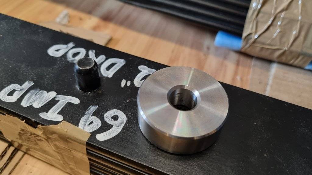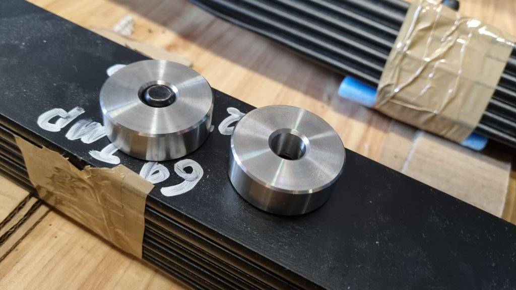 And since I didn't want to cut off and replace the original spring perches, I had to come up with a solution to adept the new, smaller eye bolts of the new leaf springs to the bigger holes in the spring perches made for the isolators.
