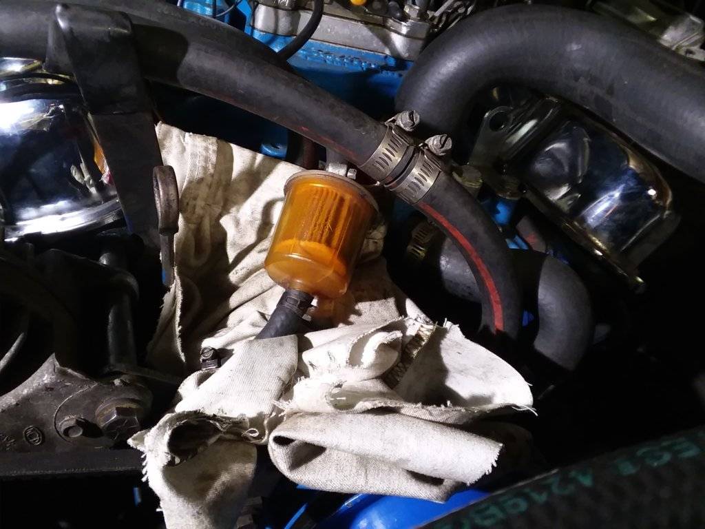 Replaced inline 5/16 ID filter after the fuel pump with Mr. Gasket 9745