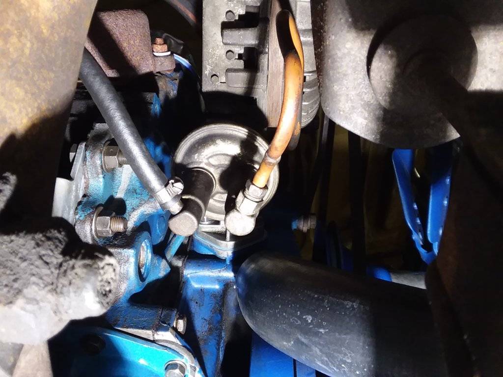 Old rusted metal case inline filter before the fuel pump, between gas tank and pump.