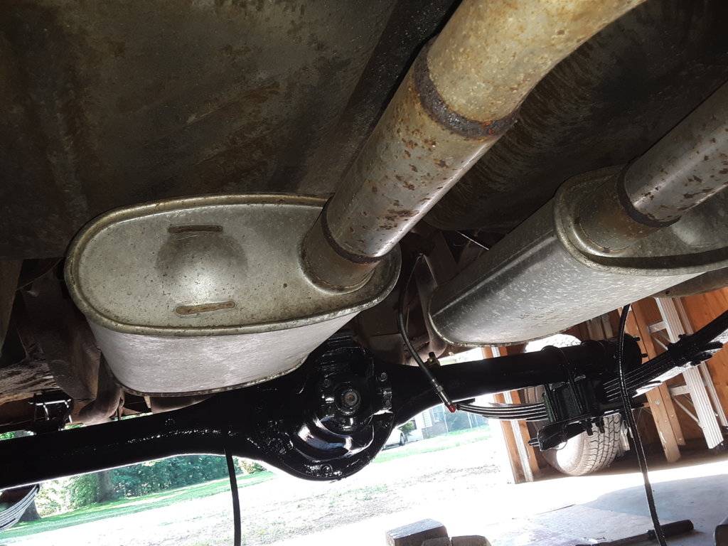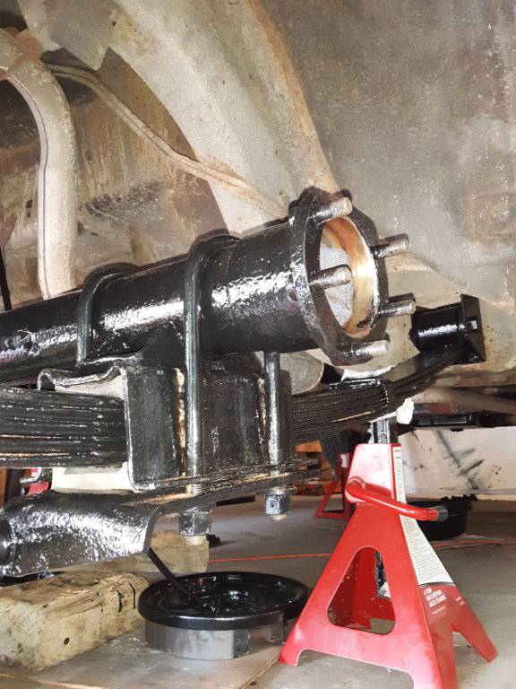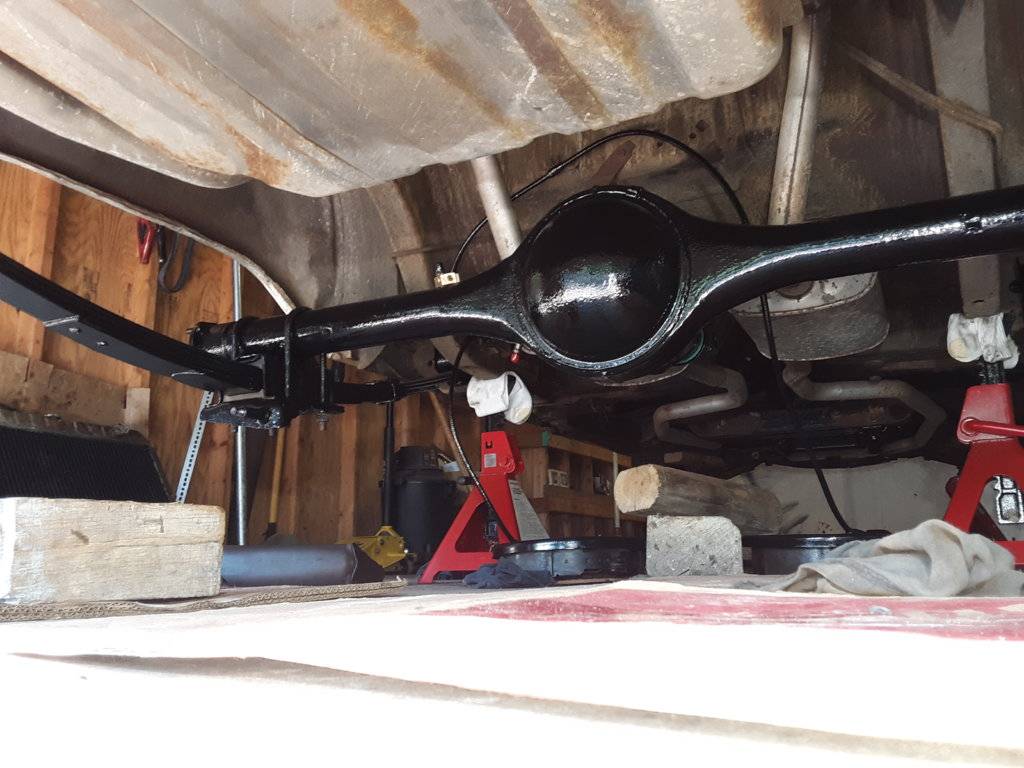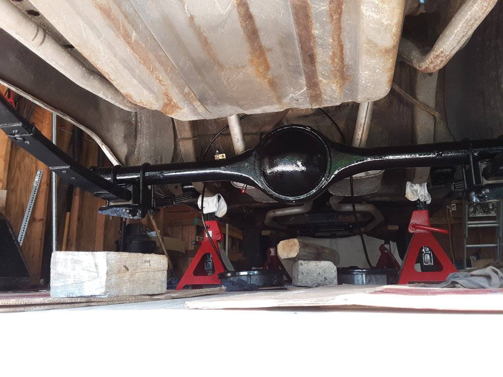 · 8.75 axle: we carried the axle from the workbench in the garage out to the jack which was behind the Fury. I had a green towel over the jack saddle. Family were at the axle shaft mounting flanges of the axle housing making sure it stayed level. Another family member held up the nose of the axle from under the car while I pushed the hydraulic Jack under the car. As I got under the wheel well, lifted axle and continued to move forward until it was positioned over top of the mounting studs on the Leaf Springs.