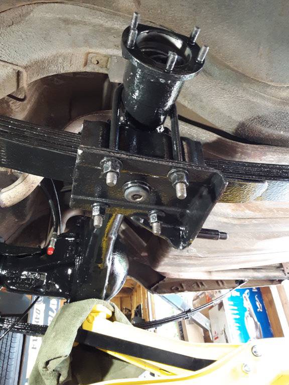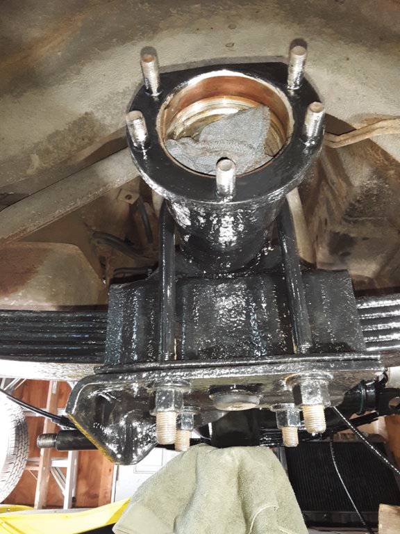 · Leaf spring mount for the axle housing has a lower metal mount, which is also the shock mount, then there’s a lower rubber insulator that goes on the stud at the bottom of leaf spring, then there is a matching rubber insulator that goes on the stud above the leaf spring, then there is another metal piece which goes over the upper insulator and centers on a circular rubber protrusion at the top of that insulator. The axle has a large circular hole in its mount which goes over the flanged area of this metal mount that goes around the circular rubber portion of the insulator.