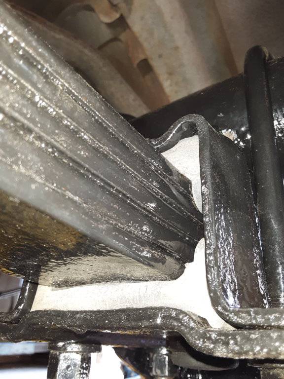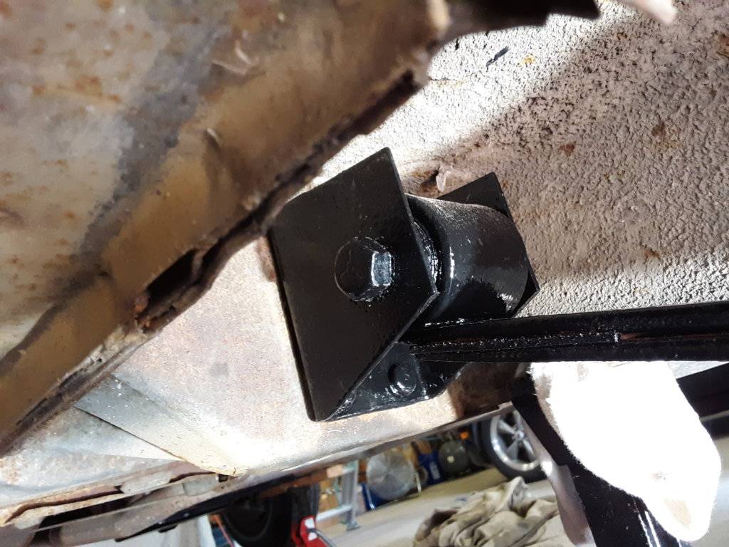 · Leaf Springs and Front mounts/hangers: assemble loose on work table. Front mounts have horizontal edge facing up, angle edge faces down. Run bolt through from the outside, nut at inside, hand tight. (Front Mount: POR 15 had closed up the boltholes slightly. Half inch drill and appropriate sized bit to drill out the paint, so Bolt could go through.) Bolt goes through front mount, through spring eye, through front mount, nut on the inside.