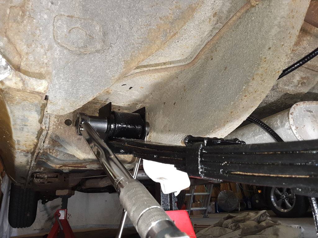 · Rear shackles and rear mounts: lift axle at center using hydraulic Jack. Shackles fold and look like 2 ends of a scissor close together. The open scissor is above the level of the rear of the leaf spring. Move the rear mount portion to flush with the subframe/torque box and its 3 mounting holes. Install 3 bolts through rear mount, each side. 9/16 long socket, 3/8 ratchet, leave slightly loose.