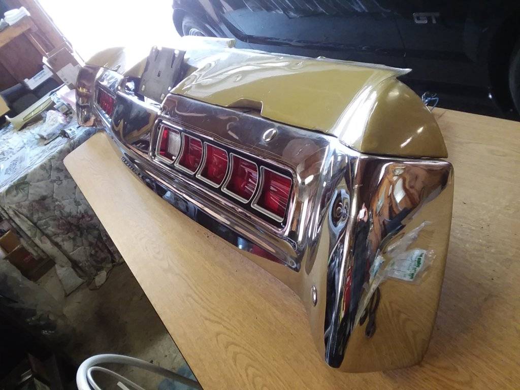 Turned bumper over on work table. Attached taillight lens, NOS on left side. Looks OK from 10 feet.