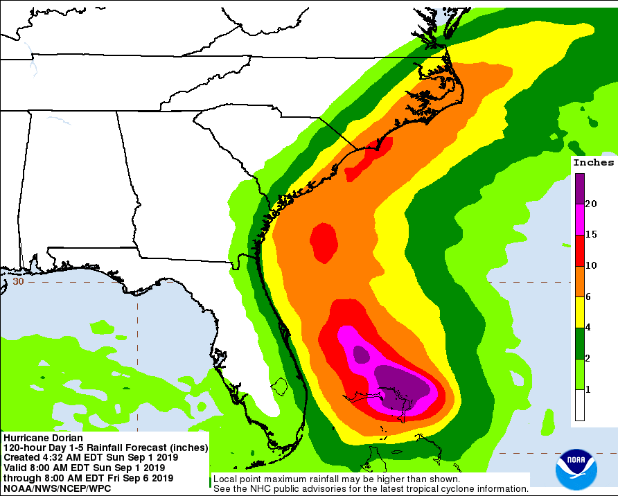 • Dorian’s landfall in the Bahamas at 185 mph is stronger than Hurricane Irma’s landfalls in Barbuda, St. Martin and the British Virgin Islands in 2017 (which was 180 mph).