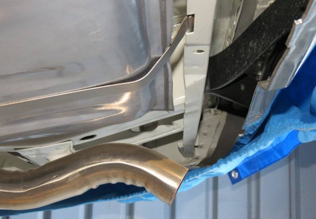 The pipes are about 3" forward of the bumper, inconspicuous except at the right angles. The clamps shown are parts store stuff, not correct.