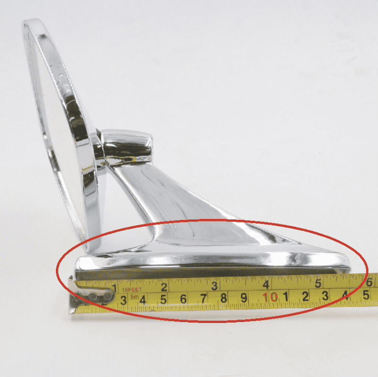 The angle doesn't really show it as well as I wanted it to, but there's about 1/2 to 1 inch between the outer edge of the mirror, and the door handles. Does anyone know of any square mirrors that have an angled arm? Something like below, but with a squared/rectangular mirror like above, and with a long mounting base like in the below second pic?