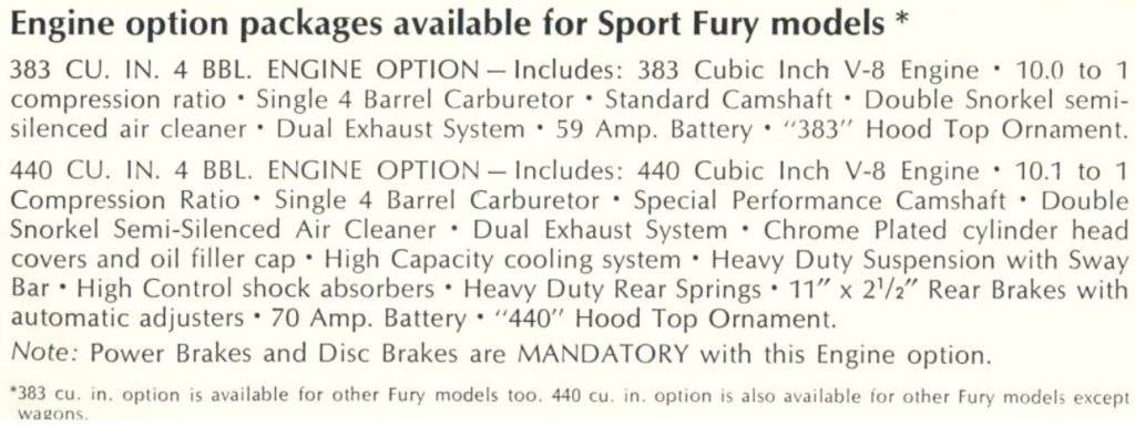 My 1968 Plymouth Sport Fury 440 4 Speed convertible has drum brakes but 15 inch wheels, you don't see that combo often. Also came with G70-15 red line tires, same as an A12 car.I've probably seen a couple dozen '67 L-code C's over the years & even more '68s. I've never seen single '67 without discs but the majority of later years were drums. I owned a '68 Newport L-code & it had drums and standard suspension. If anyone can find a single 1967 C L-code with drums, I'll eat crow. I agree the documentation is skimpy but there is some literature out there, at least for Fury.