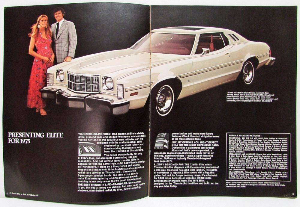 This is a 1975 Ford Elite (Neat car .. Factory 460, Sunroof, lotsa options, same as brochure car but the darker red, deep dish aluminums like the white one, but i digress).