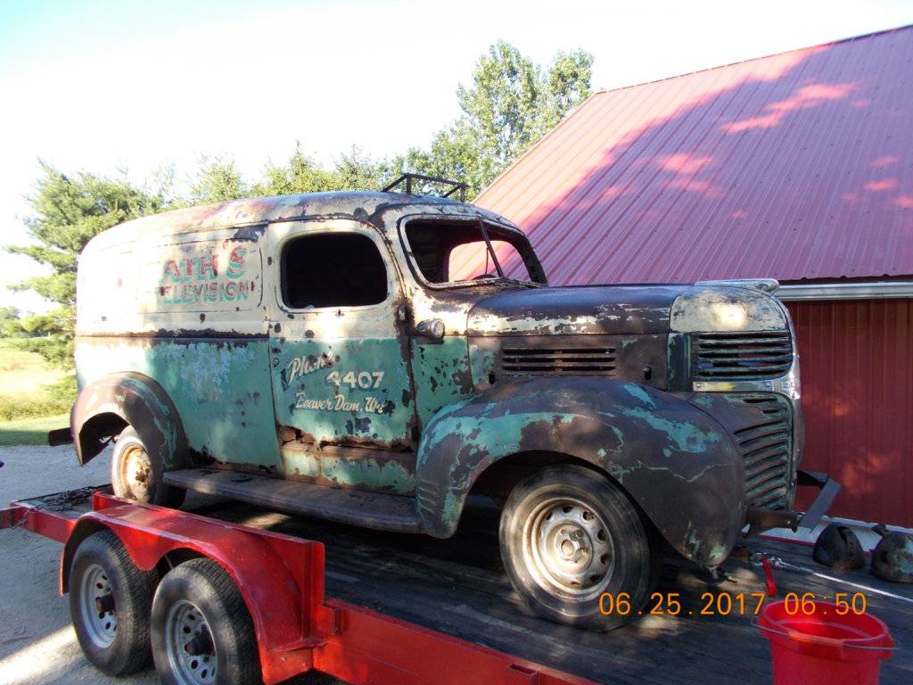 That is one cool find. Gonna keep/preserve the old paint job. I guess that's the style nowadays. Anyways you do it up that is pretty rare and cool.Helped my brother enlaw drag this 47 Dodge panel out of a tree row where it had sat for 50 years to become lawn art at his Mopar farm. Kamraths was a well know TV and appliance business her in Beaver Dam Wi. That's Perry from New Zealand and John from Appleton who came to see our collection of cars in Perrys 73 Imp!