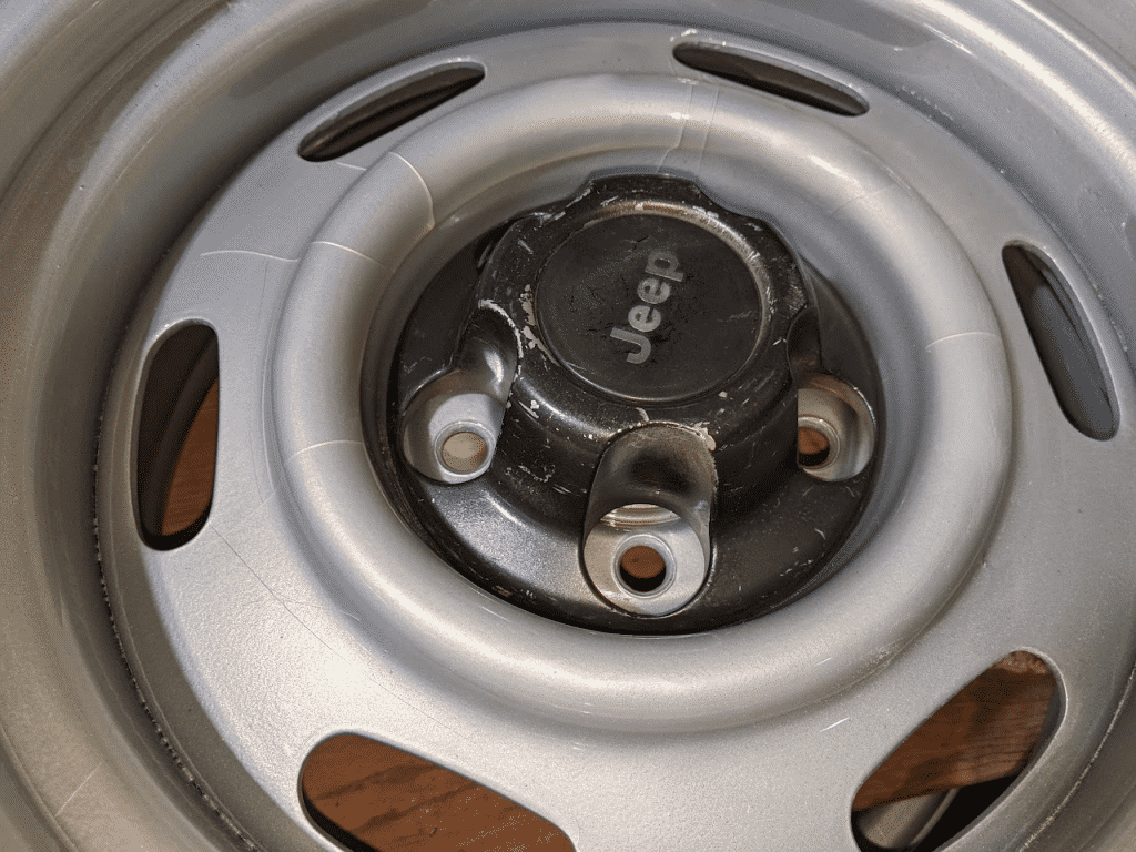 Similar attempt, but with this readily-available centercap. Fits great on a RWD Mopar wheel. On the car, notsomuch.
