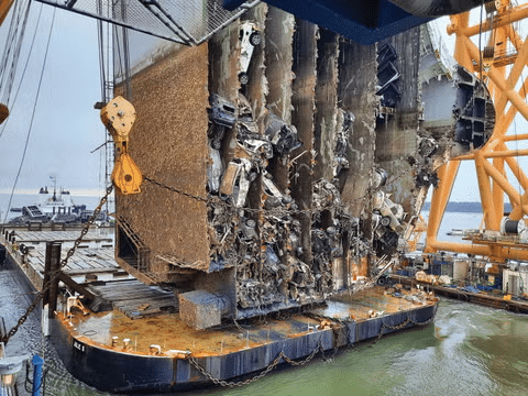 How did they do it? Basically, "chain-sawed" it, welded lift attachments before-hand, cut into 8 pieces of ~2,000 to ~4,500 tonnes each, put those pieces on other barges, and floated to recycling years (a remarkable video below ... 15 min. but fascinating if interested).