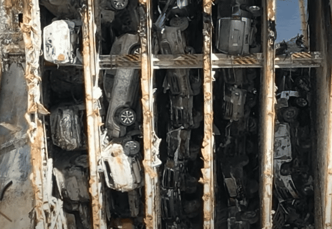 18 minute video, with drone footage, AT the salvage yard. Vehicles had to be retrieved and separately remediated.