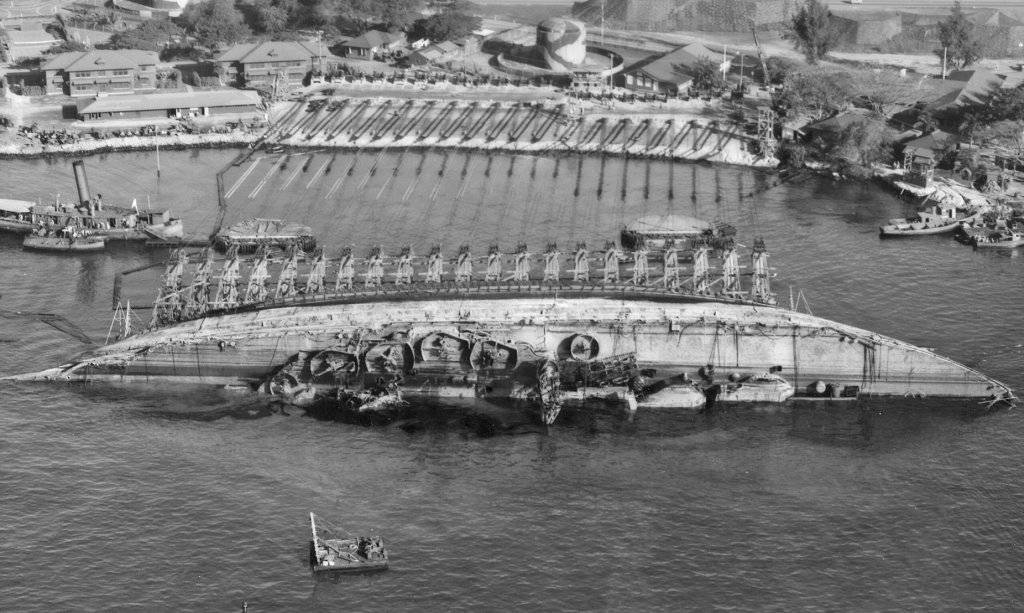 USS Oklahoma met a similar fate. When Pearl Harbor was attacked, she was berthed next to USS Maryland. Because of that, Maryland was spared serious damage, but Oklahoma was torpedoed and bombed and the torpedo damage caused her to capsize. Salvage operations began in mid 1942 and lasted almost a year. After she was righted it was determined that she would not be repaired and returned to the battle line partly because of the extent of the damage but also because she still had the reciprocating engines she was originally built with (her sister Nevada was built with turbines). She remained at Pearl until May of 1947 when she was set to be towed to San Francisco to be scrapped. Around 500 miles from Hawaii, while being towed by two ocean going tugs, the trio were hit by a storm and Oklahoma began taking on water. The tug captains saw that she was listing, contacted Pearl and were told to return. However the list was increasing rapidly and the tug captains had to loose the cables or risk being dragged down with her. Oklahoma sank almost straight down. Her exact location is unknown.