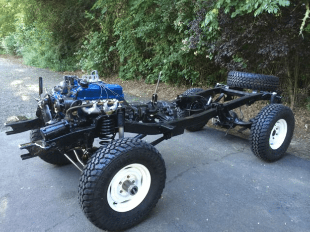 If you enlarge the underbody rear end photo it looks like the Chrysler unibody rear spring shackle perches are still being used so my guess would be is they cut the Bronco frame just aft of the transfer case and grafted to the stub frame somehow.