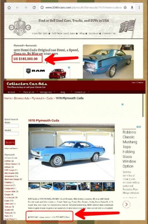 for sale, an original 1970 Hemi Cuda, 426, 4 speed, shaker hood, this is a real factory hemi car and a N96 shaker hood car , NOT A CLONE. Totally restored, a strong #2 car. the engine is a correct date coded engine with the right vin #, but not the original engine. the car was an automatic transmission car originally and has been correctly converted to a 4 speed transmission. it has a dana 60, 4/10 gear, rear end. B-5 blue, ralley dash, power steering, power disc brakes. no build sheet was found during restoration. the car is in perfect condition, like new. $ 350,000 call 941-380-6290 Bitcoin accepted