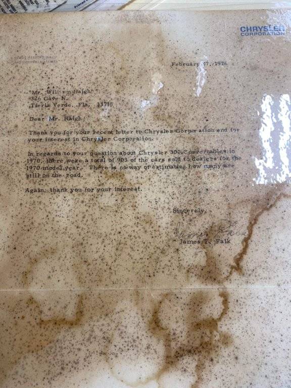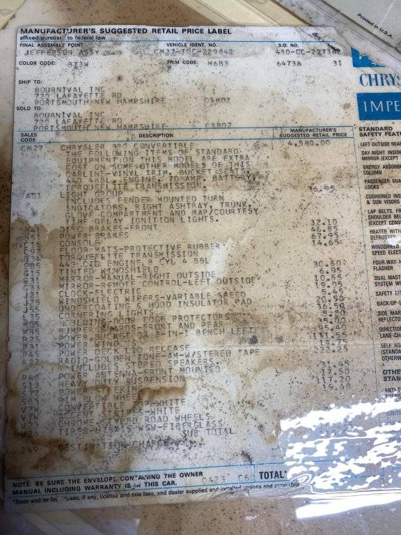 I'm not seeing any signs of wet storage, although the pictures don't show the shifter or TS stalk, which is my first place to look.Hey! This is great info, even though the Chrysler letter and window sticker are very difficult to read. Much appreciated. Looks like this car started life in NH, migrated to PA and was finally stored somewhere wet. . . All red flags. I think this car is almost a Parts Car.