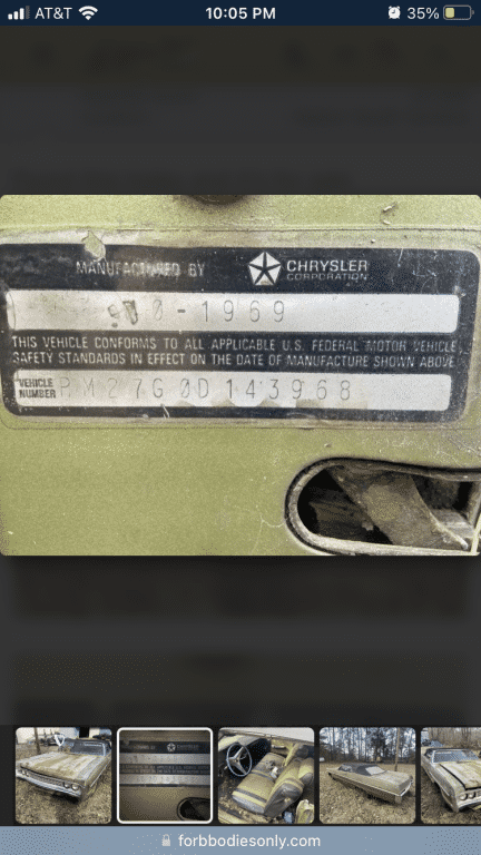 Thanks to @commando1 we have the fender tag of CM27T0C124352 -- an FY4 300 'vert that has been repainted in green. The SBD was September 18, 1969. This car is loaded with options. It is currently for sale in Florida, as discussed in this thread.