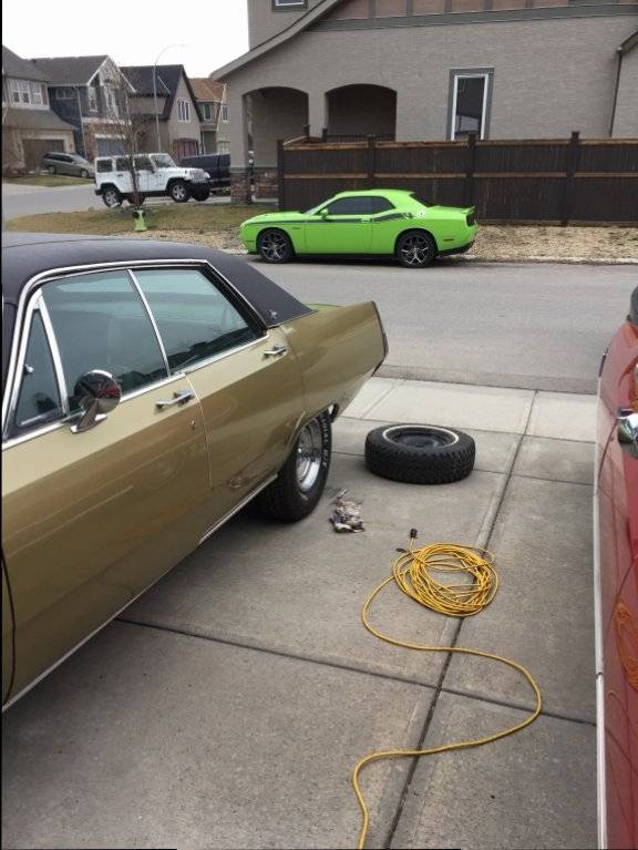 Ya I like the road wheel look also, I think the car stands way better with road wheels I have 255/70/15 on the back and 235/70/15 on the front.Be a devil and use the road wheels. You can always put the hubcaps back later. She's looking great.