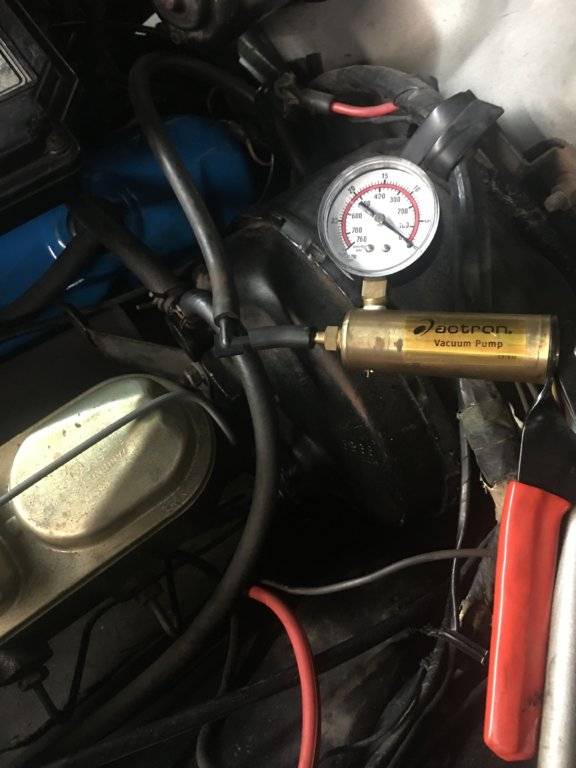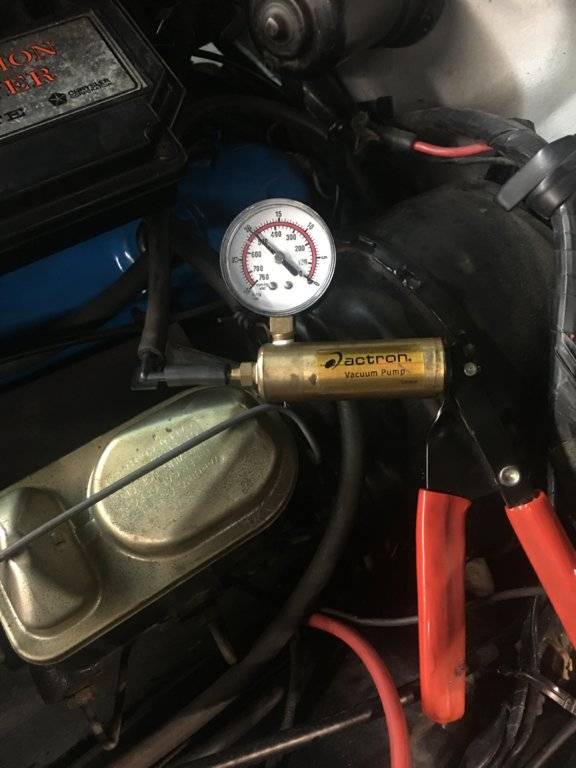 Here is my handheld vacuum guage and pump connected to the line that feeds the parking brake release switch on the steering column. Transmission was in park so it should have held some vacuum off or least given some resistance. No discernible vacuum accumulation. No resistance. Sucked on it and it was like drawing on an unlit Churchill cigar. It’s a big line and I gave it several good pumps but it just wasn’t going to hold vacuum at all.