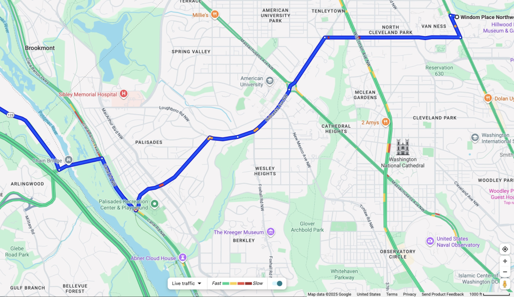 2. 10AM: Departure! We all leave Windom Place and head to McLean, VA to meet up with @73MFImperial -- whom we should reach around 10:30AM. To get to McLean, we will start by turning left on Connecticut Ave. NW and then making a right on Van Ness St. NW (see map above). We take Van Ness all the way to Nebraska Ave. NW, turn left at that light, and drive on Nebraska all the way to Arizona Ave. NW. We make a left at Arizona, and drive AZ all the way down to Canal Road. We turn right on Canal, make a left at the first light to cross the Chain Bridge, and make a right at the end of the bridge onto VA-123 -- which takes us to McLean (see map below).
