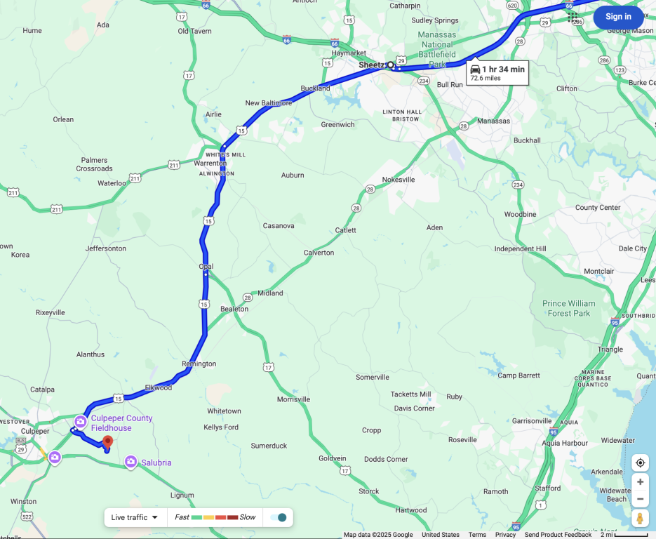 5. Gainesville to Culpeper: we leave the Sheetz station and head to the winery. The directions are simple: get onto Lee Highway (VA-29), which becomes VA-15 around New Baltimore, and continue on VA-15 till Culpeper.