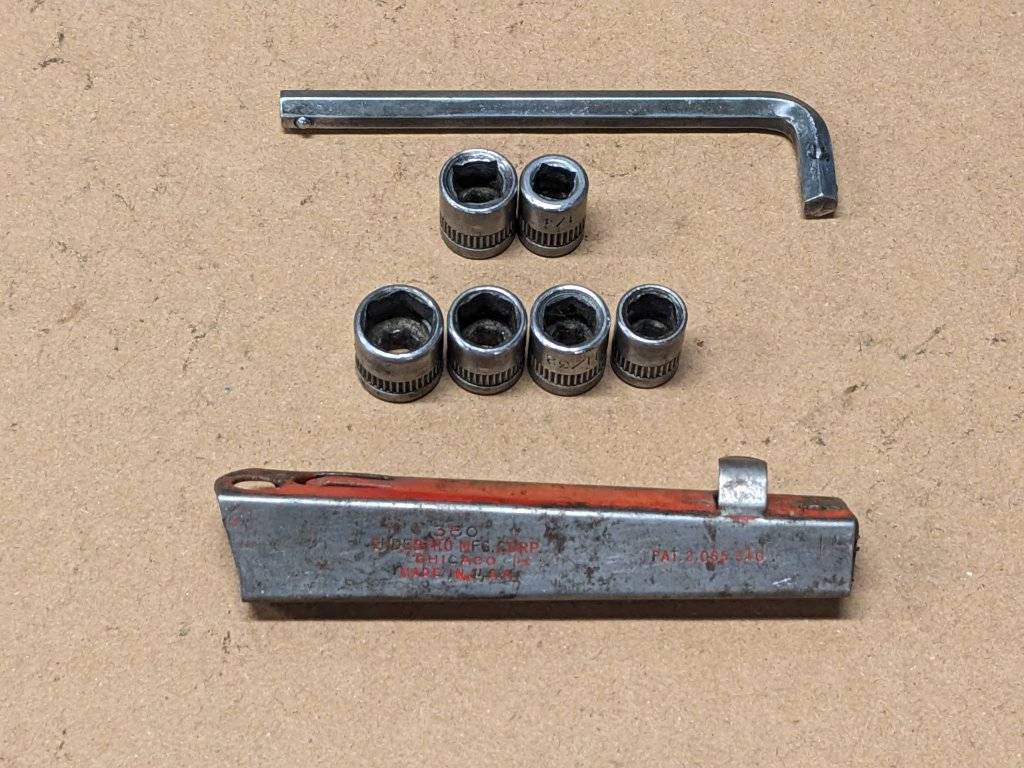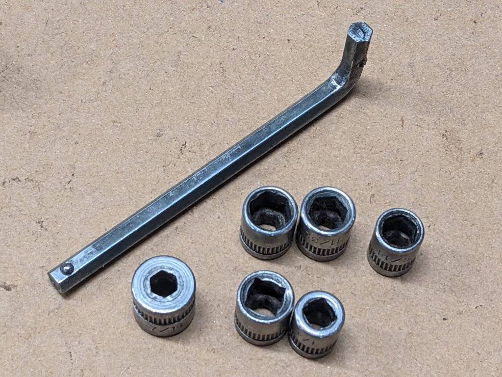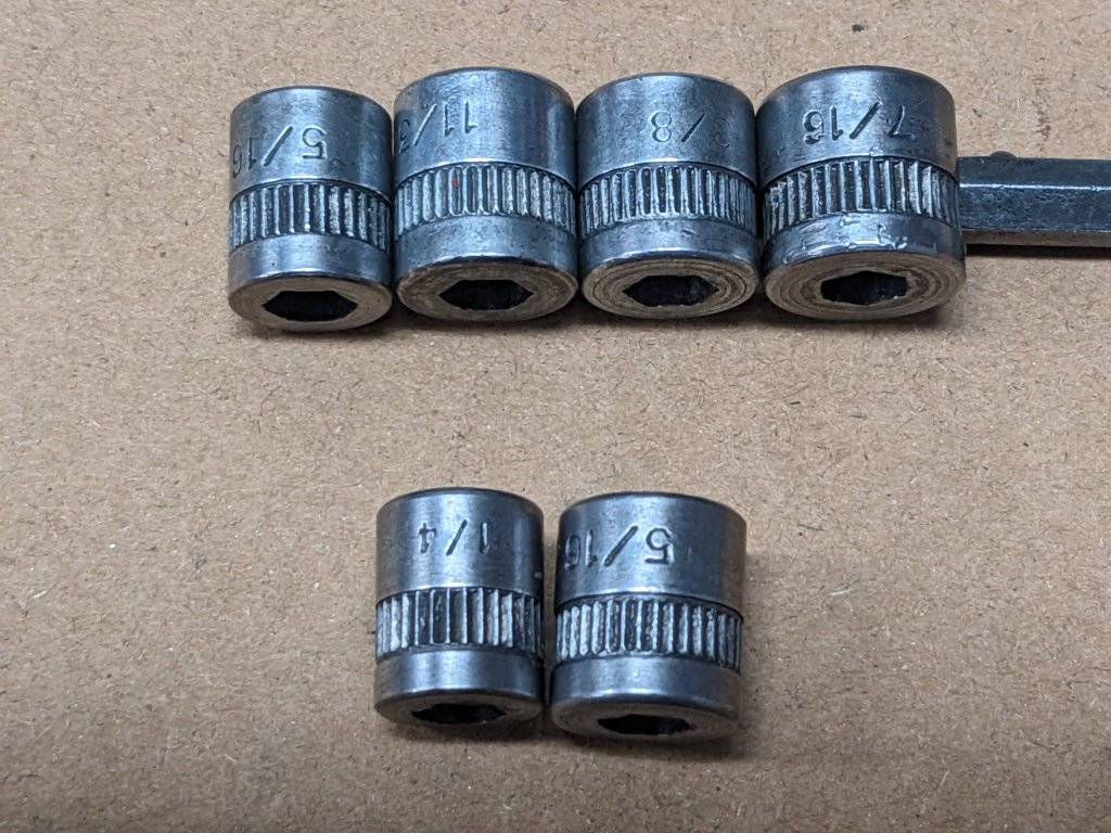 Almost just like the first set of sockets I bought to remove the cylinder head on a cast iron Briggs & Stratton horizontal reel mower engine that me and a friend were going to bolt onto a bicycle not to say make a Mini-Bike (that came later) but kind of motorcycle as it was a full size adult bicycle.Here is an old Indestro small socket set that I have had since childhood. It's odd in that it uses a 1/4" Allen style wrench with spring loaded balls like a ratchet to hold the sockets which have a hex drive side. There are four six point sockets - 5/16", 11/32", 3/8", and 7/16", and two four point sockets - 1/4" and 5/16". The set is missing its "gripper" socket.