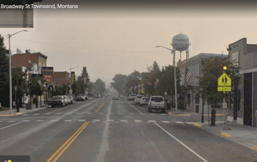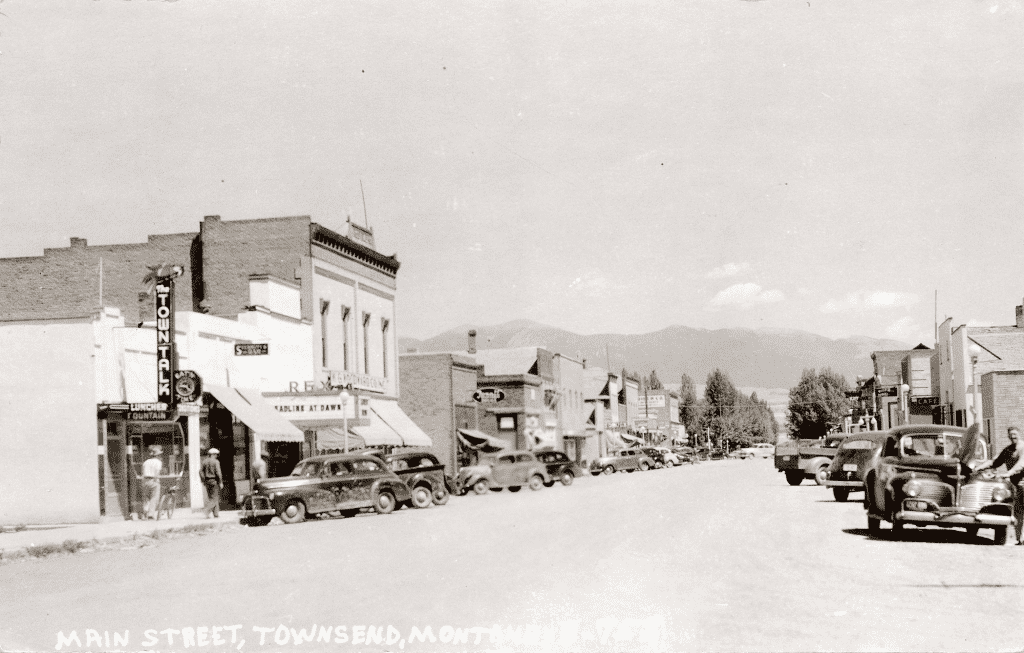 Oh yeah, that's the same town in the modern picture. Must just be misty/hazy in the background which is why the mountains don't show.Early 1960's, a downtown and gas stations. Broadway Street, looking easterly, in downtown Townsend, Montana.