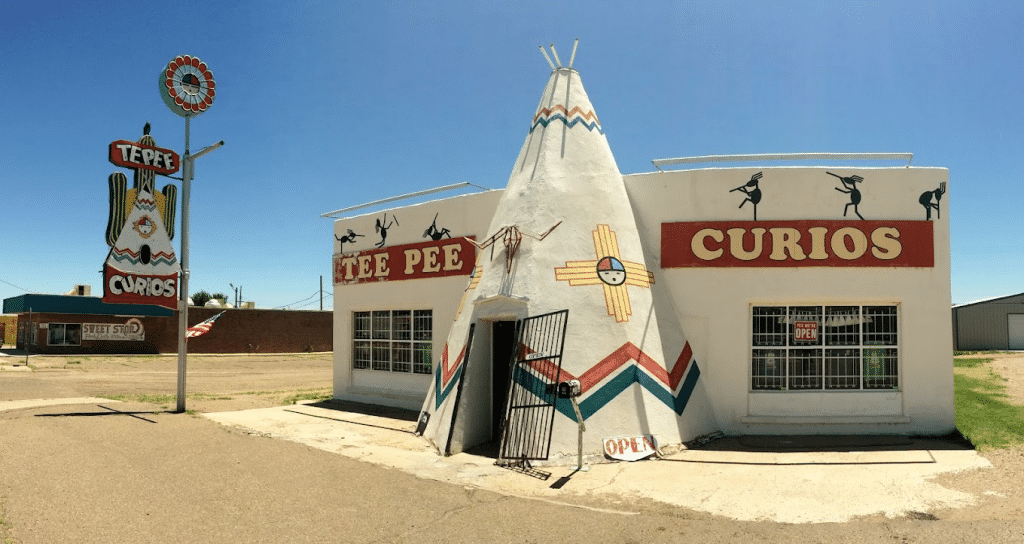 Some info from this Rt-66 site: "main street view of TEE PEE CURIOS or according to the spelling on the neon sign, "TEPEE", (at) 924 E Rte 66 Blvd in Tucumcari, NM 88401. Built in the early 1940’s, this old Gulf gas station eventually succumbed to the widening of Route 66, losing its pumps but gaining new business selling curios to Route 66 travelers."