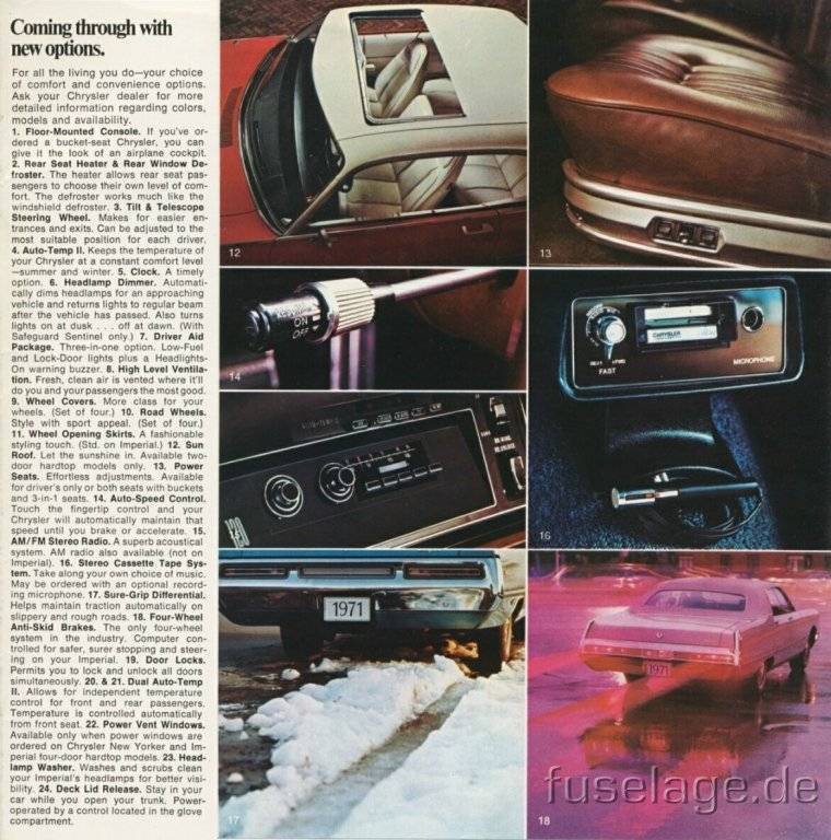 Note that the power antenna was optional on all 1969 Chryslers, including the New Yorker. If the car came with a manual antenna, it could easily be removed, leaving only the mounting base, which gives the impression of a seemingly "flush" antenna while in fact there is no antenna at all. I guess this was the case with all press photos or pictures found in brochures so as not to have a protruding antenna mast distract from the car's lines.