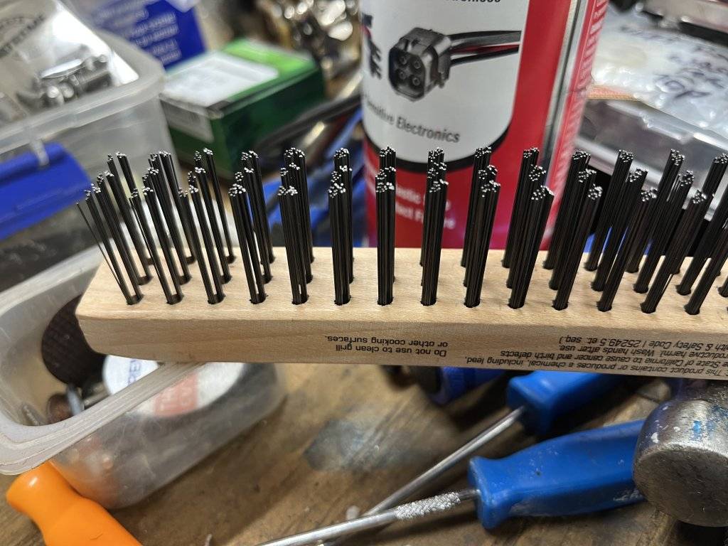 I needed a source for these little buggers and after some searching I settled on some new bristles from a wire brush. They were the same thickness and had just enough spring action to work.