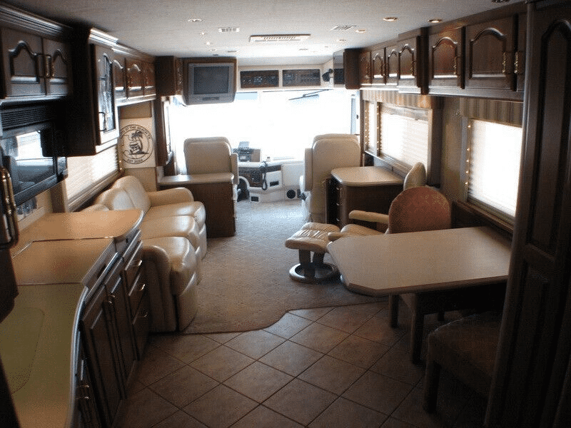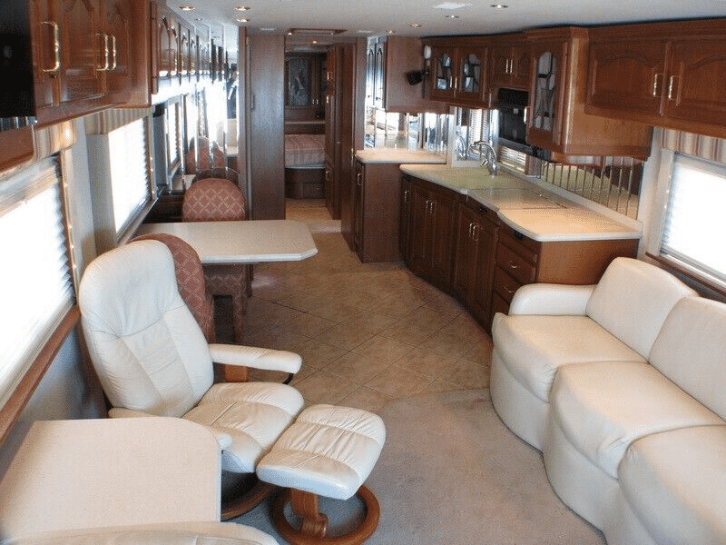 Naw, it aint a Prevost or a Newell, or some other Taj-Ma- Bus brand, but it is pretty well equipped. 505 HP Cat 12 turbo diesel, 100K miles. Nice, not gaudy. Neat amenities.