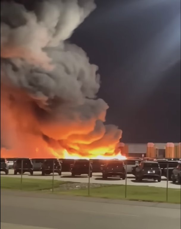 Zero emission vehicles burning in the holding lot at the Rivian factory in Normal Illinois.