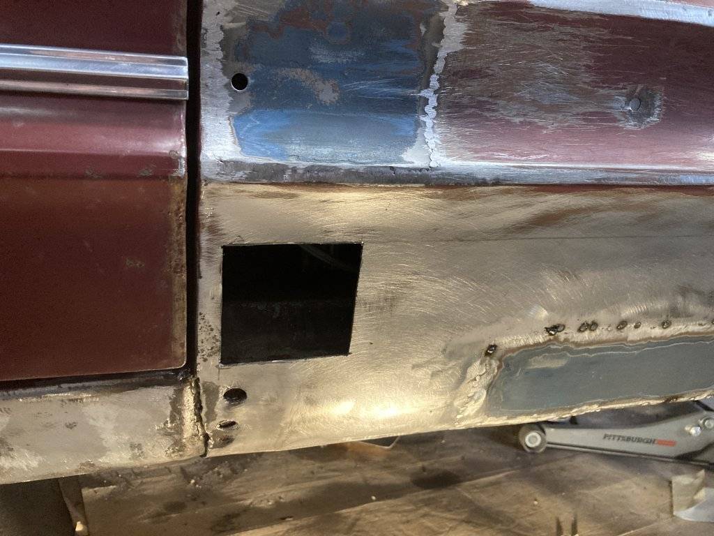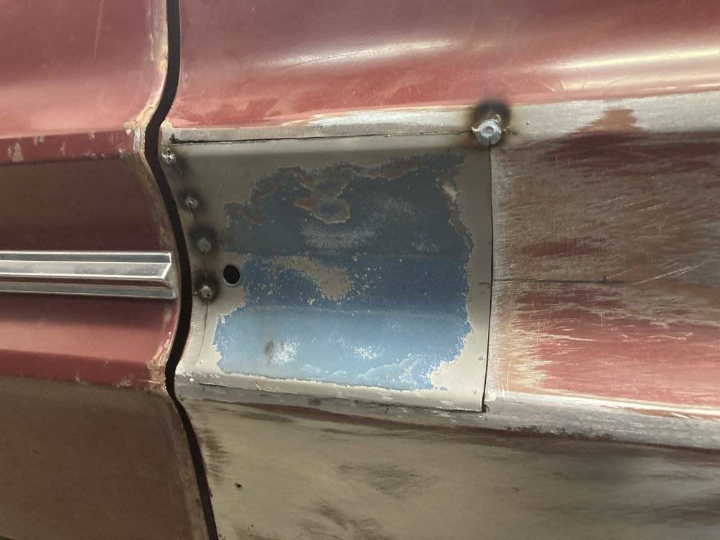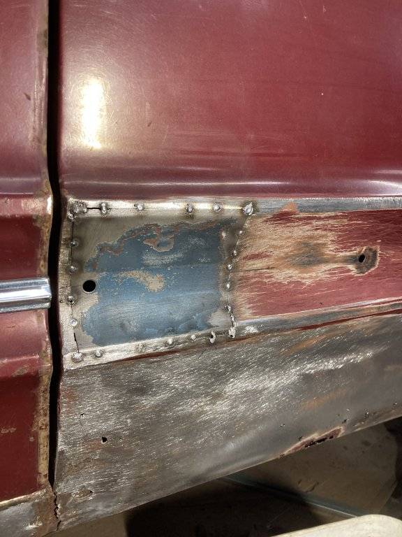 This is the last patch in front of the wheelhouse. I used a rusty door from the parts car for the patches. Waste not, want not.:lol: