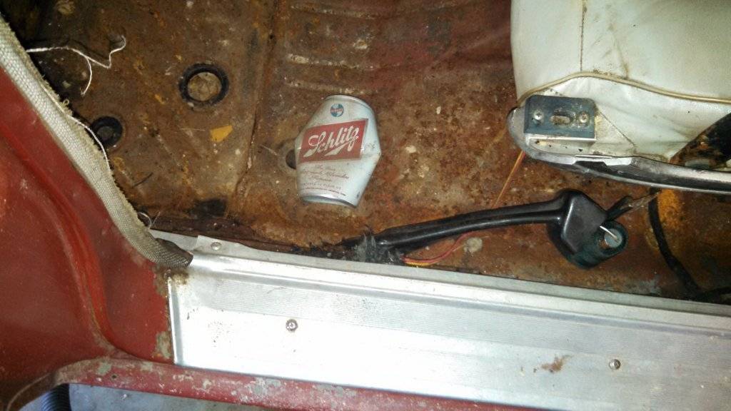 Also spent some time vacuuming out the trunk and under the front and back seats. Some rusty scale and a lot of other debri was present. I pulled the back seat bottom out of the car, and look what Earl found stuffed into the seat springs:
