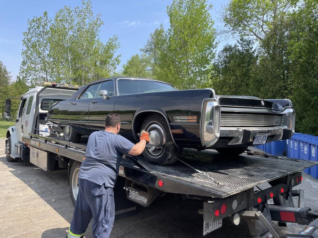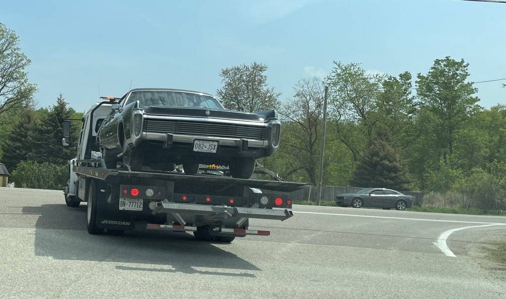 BEAUTIFUL!Picked up my triple black 73 Imperial this morning. Beautiful day for the pick up, but the drop off not so much. Severe storm warning alert just as we are arriving into Toronto, flat bed 25 min behind me. Just as he pulls onto my back street the wind and clouds open up. I was lucky to get him to unload the car, dropped the Imperial in the middle of the lane/street and ran. Good friend and neighbour helped me push it aside to a temp landing spot.