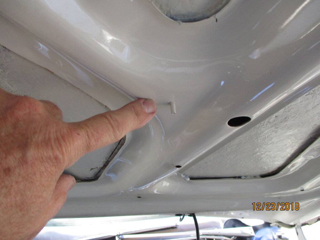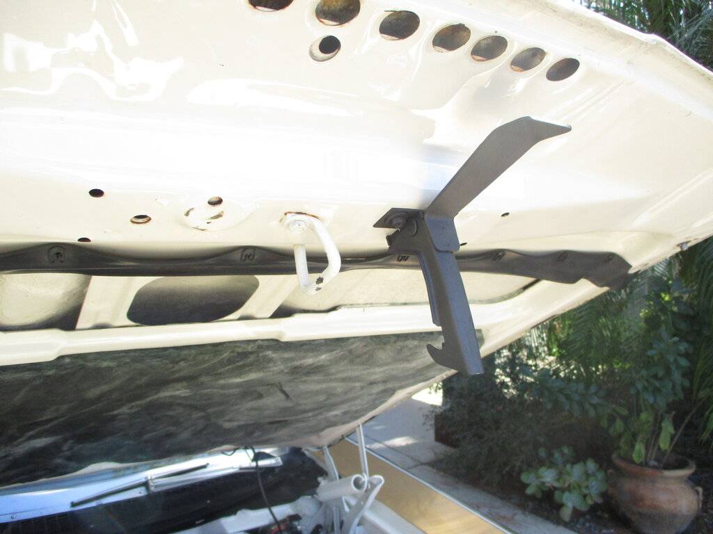 Here's a shot of all work completed, latch in proper phosphate (Eastwood), new hood pad. But what are those eight holes in the steel portion for?
