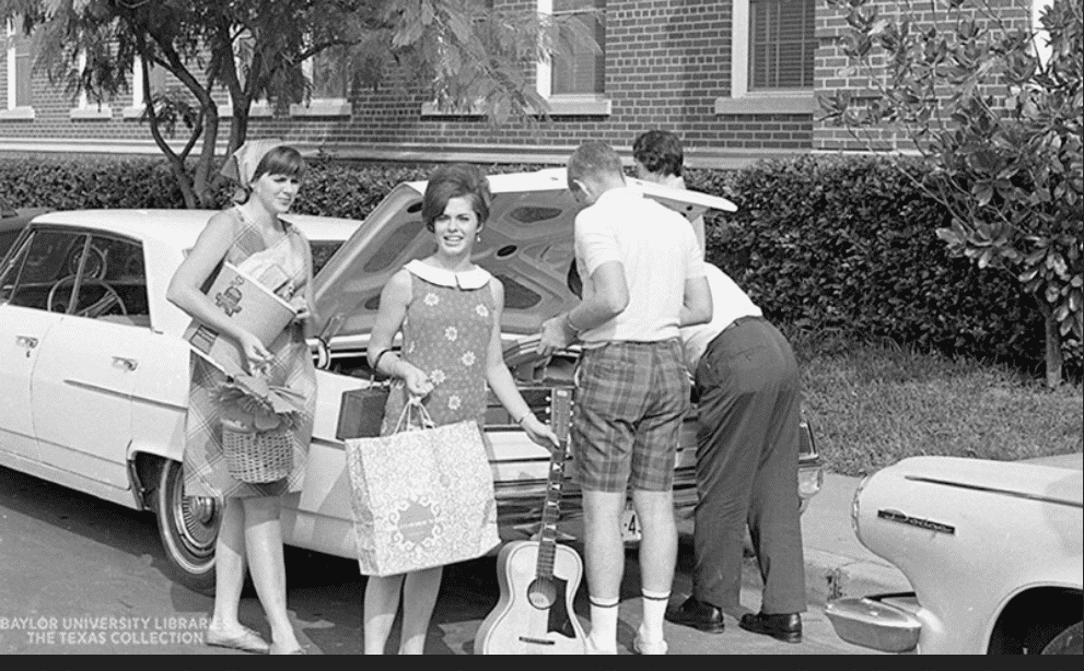 advertised as "moving into Baylor Unitiversity in the 1960's". Looks like unloading a early 60's Buick sedan parked in front of a vintage mopar?