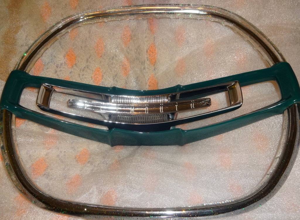It was stripped to the metal rim, which was rechromed. then the center hub was recast in the correct color material and the transparent rim recast using "glitter" colors selected by me, (green and gold). Modern materials were used to avoid future UV damage.
