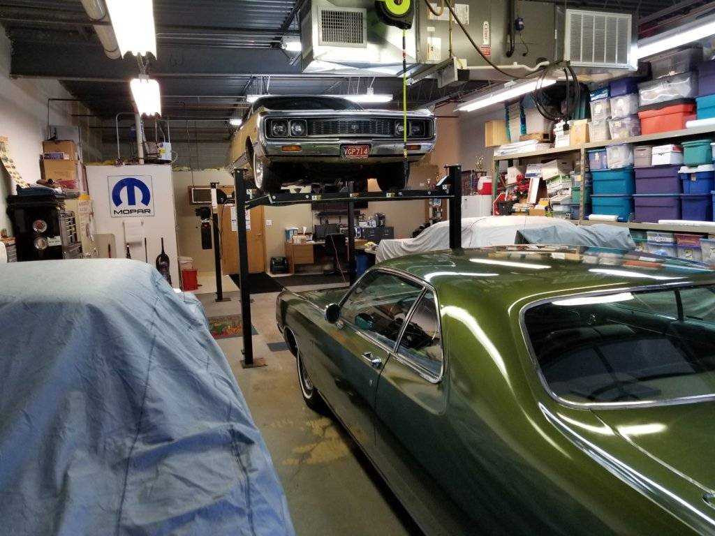 Got back to the shop and moved some stuff around and backed the New Yorker up onto the hoist. With the seasons changing, I plan on pulling the trans for a rebuild and take the 440 out of the car to re-gasket everything and give it a good freshening up.