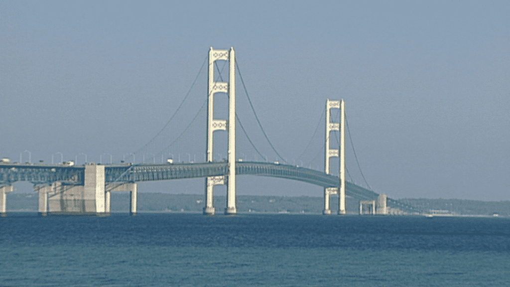 Mackinac (pronounced "ma-kuh-naa") Bridge, connects lower and upper peninsulas of the state of Michigan. Opened in fall 1957, it was under construction from 1954 to 1957.