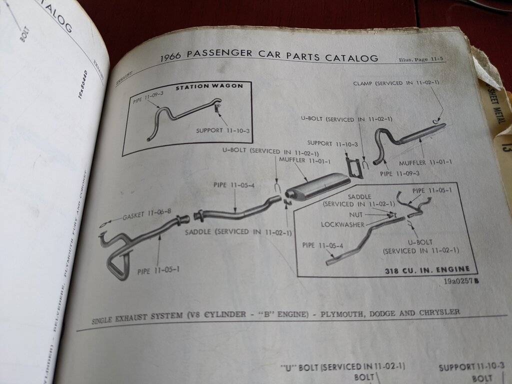 I took the factory hp dual exhaust system from a 68 dodge monaco wagon 4door/5 door along with the hp manifolds and installed it on a 66 dodge Monaco 2 door hard top. Fit perfect, tail pipes and all. Wouldnt of had to change the passenger side intermediate pipe and tail pipe but the muffler was different and welded on so I changed it all. Kim
