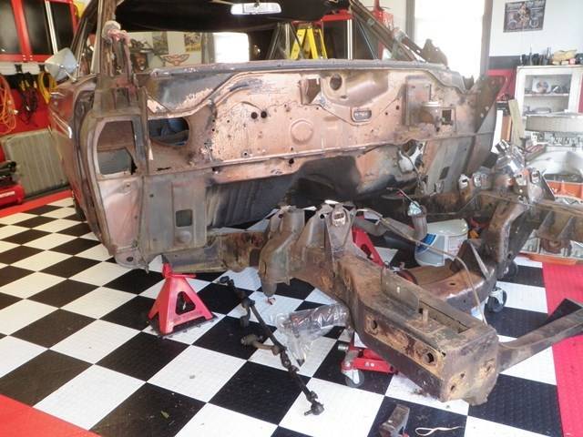 Time to get to work on dropping the front frame section off, anyone have any experience with removing and reattaching/realignment of the frame your experience and comments would be most welcome. Plan on drilling some small holes two on each side to help with re-alignment. Need to clean the frame real good inside and out and paint it for reinstall. Also while the frame is off fix all that rust inside the cowl and the two holes that are rusted into the passenger and driver side compartments. Any experience and comments with that as well would be welcome. Car is original 383 with manual trans and the engine is 1968 H.P. Block, color should be Copper with the two tone (twice the price) Copper and Black interior. Had a real nice set of interior door skins and rear skins that got absolutely ruined in storage, (water, squirrels, mice, mold). When I bought the car it had Ford Granada seats front and rear without center consule, plus they cut the mounting brackets off. Got my work "cut out" for me no pun intended, most of my friends tell me to just go and buy a complete car one and be done with it, but where's the fun in that? (besides they don't own Mopars). Thanks again for Looking and Your Comments!!