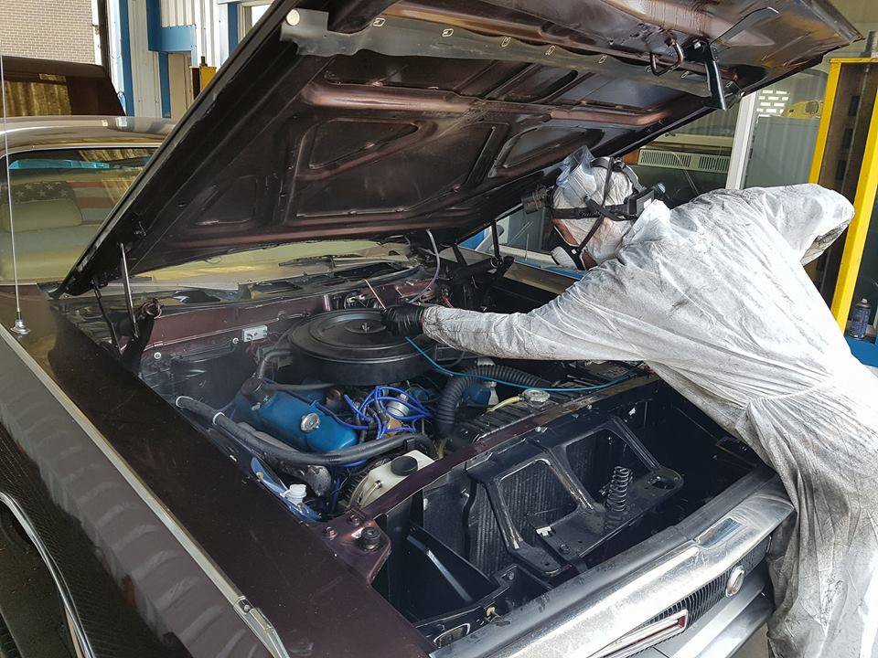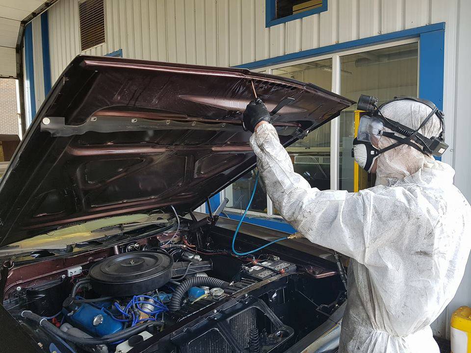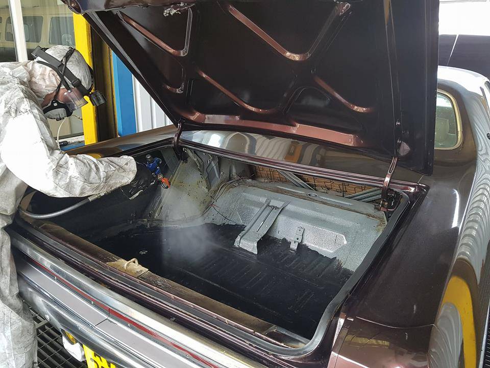 The entire process takes about FOUR hours, start to finish. These guys treat everything. Trunk, rear quarters, sail panels, rocker panels, entire underside, chassis rails, engine bay, fenders, trunk and hood skins, doors, behind all rocker trim, window trim, fender trim. In fact the only parts not treated are headliner, seats, carpet, dashboard, brake pads and shoes. They can't guarantee the shoes and pads are NOT covered, so you would be well advised to drive carefully for a mile or two.