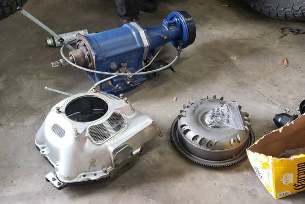 50's Mopar PowerFlite 2 Speed Automatic Transmission, Bell Housing, and Torque Converter, Starter, and Generator. Car had around 500 miles on car when it was wrecked, and transmission was pulled. Transmission was used in Chrysler, Plymouth, and Dodge 50-60 Passenger Cars.