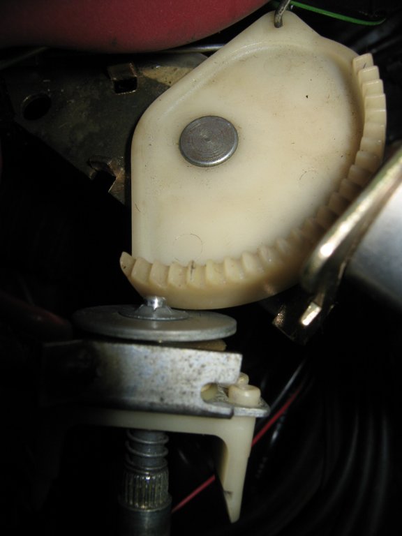 well, in pealing this onion it's gotten a little stinkier. I was testing the control cable w/ the dial control up front. I noticed that it would turn and turn in any direction and not hit a stopping point. In the service manual it says that it should have a stopping point ...this is how you properly set the control cable. Long story short I pulled out the switch control from in the car, and found the small plastic sprocket was broken and in pieces. It is suppose to turn when I turn with the control/selector and then it turns or moves the larger half sprocket that then moves the control cable in or out at the AP. I found the broken piece on the small sprocket and super glued it.