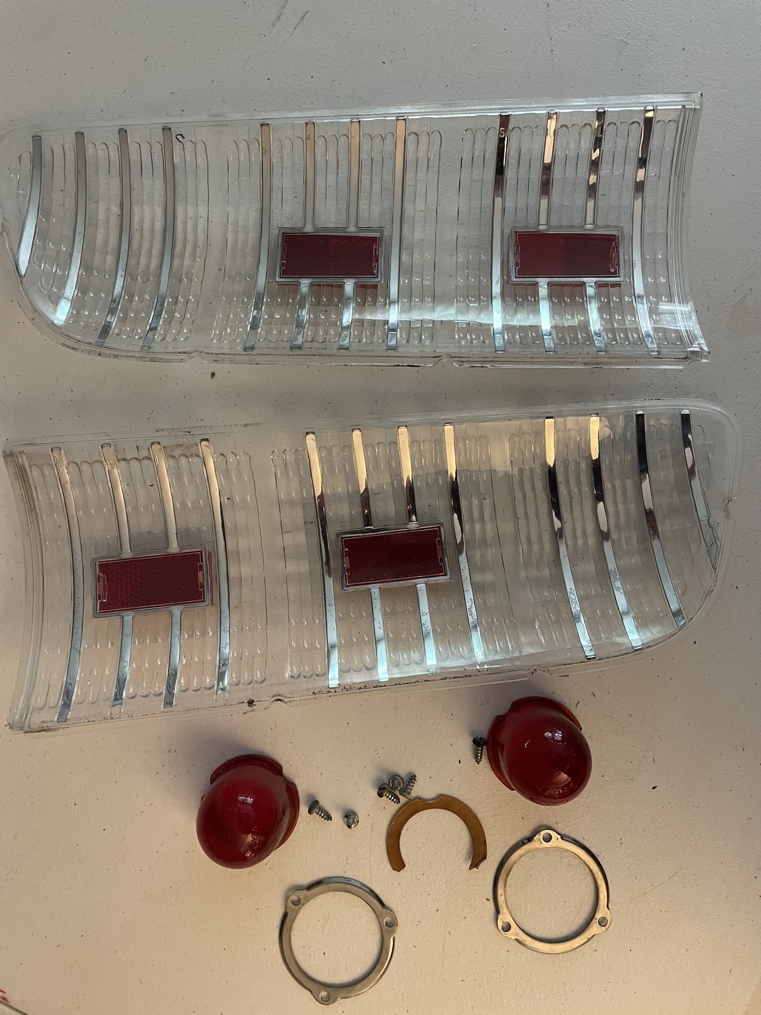 Left and right 1965 New Yorker tail light lenses. Very good driver condition with small crack on passenger side lens. These came on my 300L and I never saw the crack until it was apart. Comes with the red glass(!) defusers and difuser retainers. I'll include a piece of retainer gasket so you can make new ones.