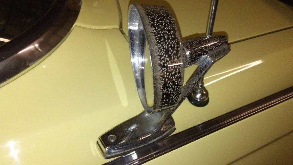 Received more parts today! I got a spare wheel cover and a passenger-side mirror assembly. The mirror housing needs to be rechromed to be perfect, but it will do just fine for now. The wheel cover has one very small ding, and will be restored like the others by me. So, here is what I have, so far...